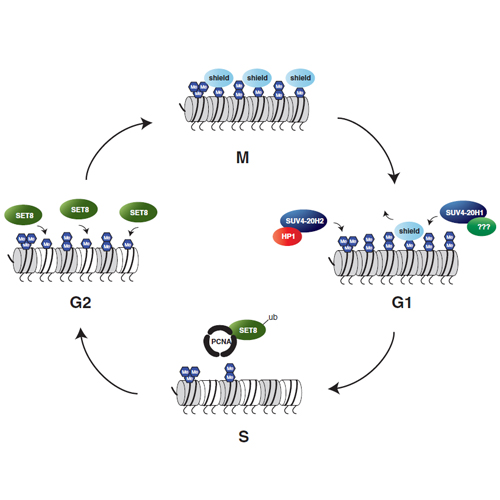 Maintenance of genomic integrity is essential to ensure normal organismal development and to prevent diseases such as cancer. Nuclear DNA is packaged into chromatin, and thus genome maintenance can be influenced by distinct chromatin environments. In particular, post-translational modifications of histones have emerged as key regulators of genomic integrity. Intense research during the past few years has revealed histone H4 lysine 20 methylation (H4K20me) as critically important for the biological processes that ensure genome integrity, such as DNA damage repair, DNA replication and chromatin compaction. The distinct H4K20 methylation states are mediated by SET8/PR-Set7 that catalyses monomethylation of H4K20, whereas SUV4-20H1 and SUV4-20H2 enzymes mediate further H4K20 methylation to H4K20me2 and H4K20me3. Disruption of these H4K20-specific histone methyltransferases leads to genomic instability, demonstrating the important functions of H4K20 methylation in genome maintenance. In this review, we explain molecular mechanisms underlying these defects and discuss novel ideas for furthering our understanding of genome maintenance in higher eukaryotes.