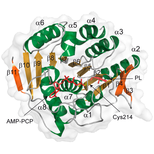 Pyridoxal 5′-phosphate (PLP) is the active vitamer of vitamin B6 and acts as an essential cofactor in many aspects of amino acid and sugar metabolism. The virulence and survival of pathogenic bacteria such as Mycobacterium tuberculosis depend on PLP, and deficiencies in humans have also been associated with neurological disorders and inflammation. While PLP can be synthesized by a de novo pathway in bacteria and plants, most higher organisms rely on a salvage pathway that phosphorylates either pyridoxal (PL) or its related vitamers, pyridoxine (PN) and pyridoxamine (PM). PL kinases (PLKs) are essential for this phosphorylation step and are thus of major importance for cellular viability. We recently identified a pyridoxal kinase (SaPLK) as a target of the natural product antibiotic rugulactone (Ru) in Staphylococcus aureus. Surprisingly, Ru selectively modified SaPLK not at the active site cysteine, but on a remote cysteine residue. Based on structural and biochemical studies, we now provide insight into an unprecedented dual Cys charge relay network that is mandatory for PL phosphorylation. The key component is the reactive Cys 110 residue in the lid region that forms a hemithioactetal intermediate with the 4′-aldehyde of PL. This hemithioacetal, in concert with the catalytic Cys 214, increases the nucleophilicity of the PL 5′-OH group for the inline displacement reaction with the γ-phosphate of ATP. A closer inspection of related enzymes reveals that Cys 110 is conserved and thus serves as a characteristic mechanistic feature for a dual-function ribokinase subfamily herein termed CC-PLKs.