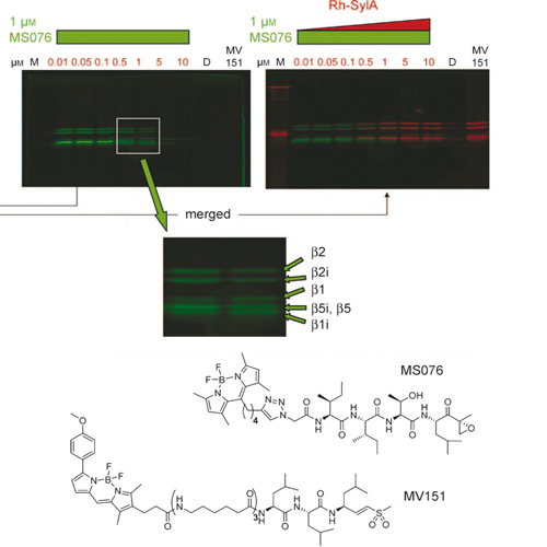 The natural product syringolin A (SylA) is a potent proteasome inhibitor with promising anticancer activities. To further investigate its potential as a lead structure, selectivity profiling with cell lysates was performed. At therapeutic concentrations, a rhodamine-tagged SylA derivative selectively bound to the 20 S proteasome active sites without detectable off-target labelling. Additional profiling with lysates of wild-type and bortezomib-adapted leukaemic cell lines demonstrated the retention of this proteasome target and subsite selectivity as well as potency even in clinically relevant cell lines. Our studies, therefore, propose that further development of SylA might indeed result in an improved small molecule for the treatment of leukaemia.